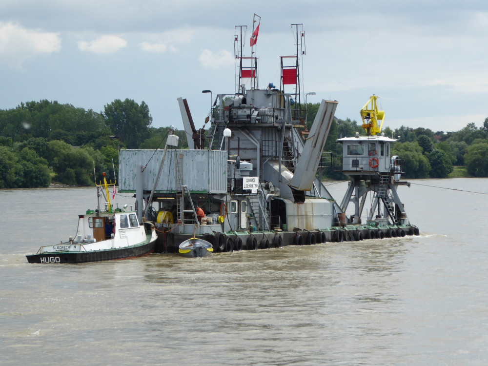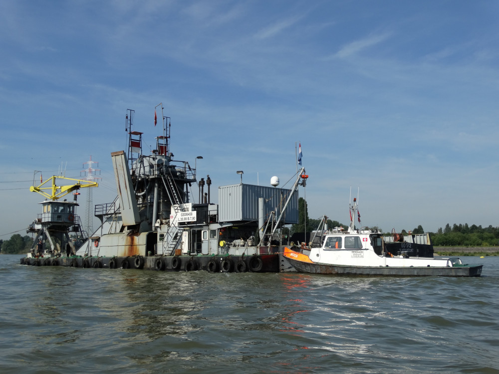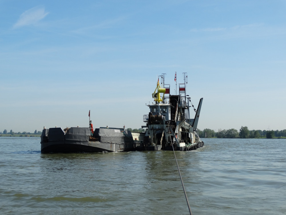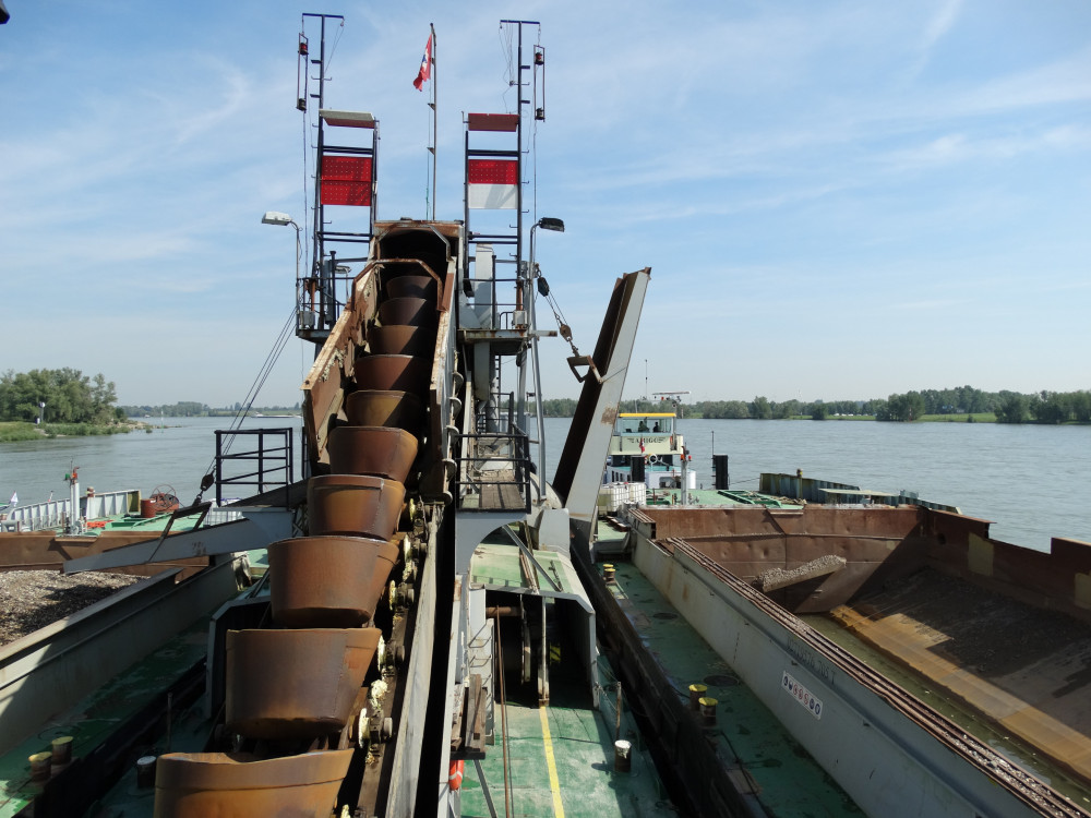 Emmer baggermolen Aalscholver, aan het werk op de Rijn
